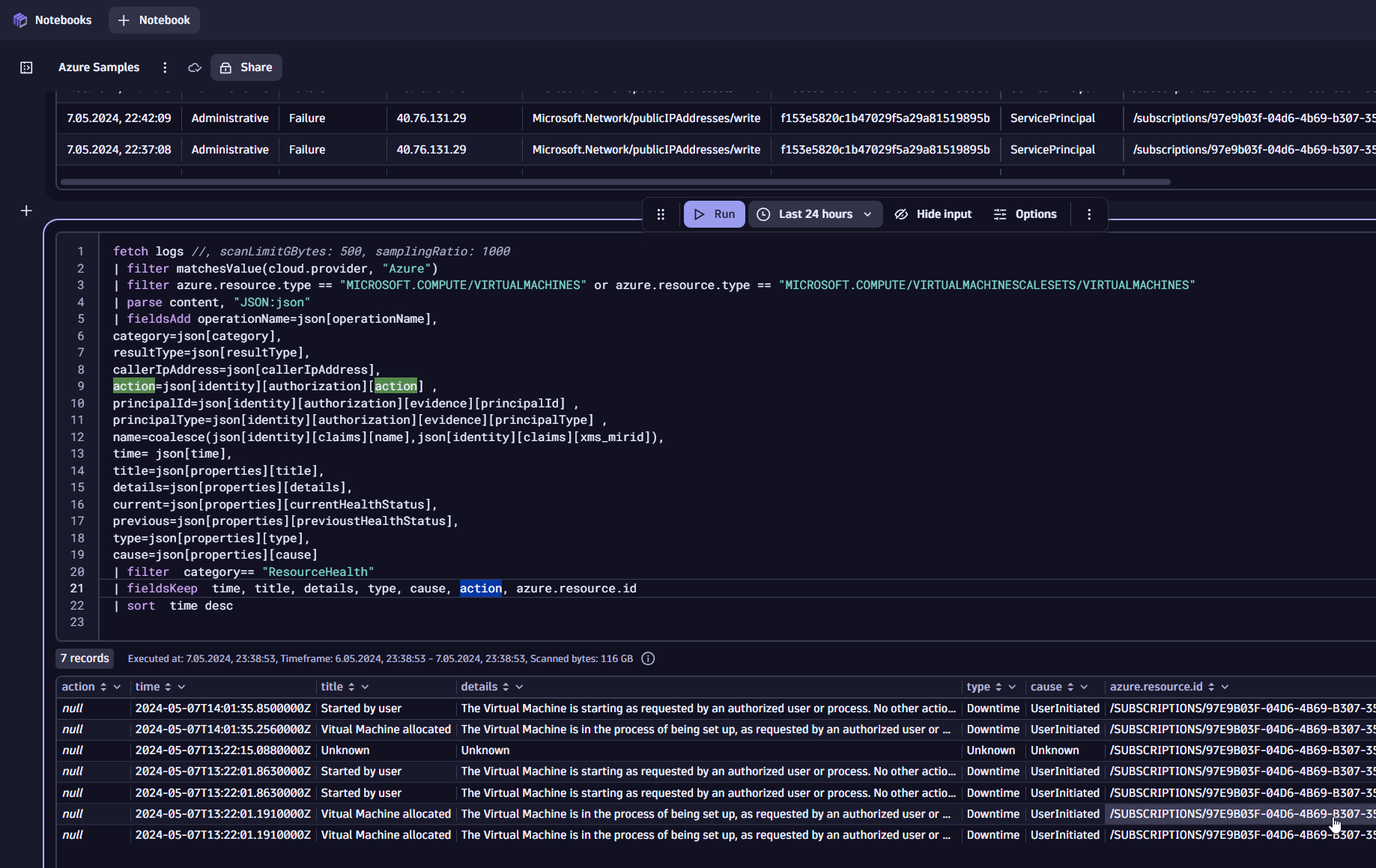 fetch logs //, scanLimitGBytes: 500, samplingRatio: 1000 | filter matchesValue(cloud.provider, "Azure") | filter azure.resource.type == "MICROSOFT.COMPUTE/VIRTUALMACHINES" or azure.resource.type == "MICROSOFT.COMPUTE/VIRTUALMACHINESCALESETS/VIRTUALMACHINES" | parse content, "JSON:json" | fieldsAdd operationName=json[operationName], category=json[category], resultType=json[resultType], callerIpAddress=json[callerIpAddress], action=json[identity][authorization][action] , principalId=json[identity][authorization][evidence][principalId] , principalType=json[identity][authorization][evidence][principalType] , name=coalesce(json[identity][claims][name],json[identity][claims][xms_mirid]), time= json[time], title=json[properties][title], details=json[properties][details], current=json[properties][currentHealthStatus], previous=json[properties][previoustHealthStatus], type=json[properties][type], cause=json[properties][cause] | filter category== "ResourceHealth" | fieldsKeep time, title, details, type, cause, azure.resource.name | sort time desc