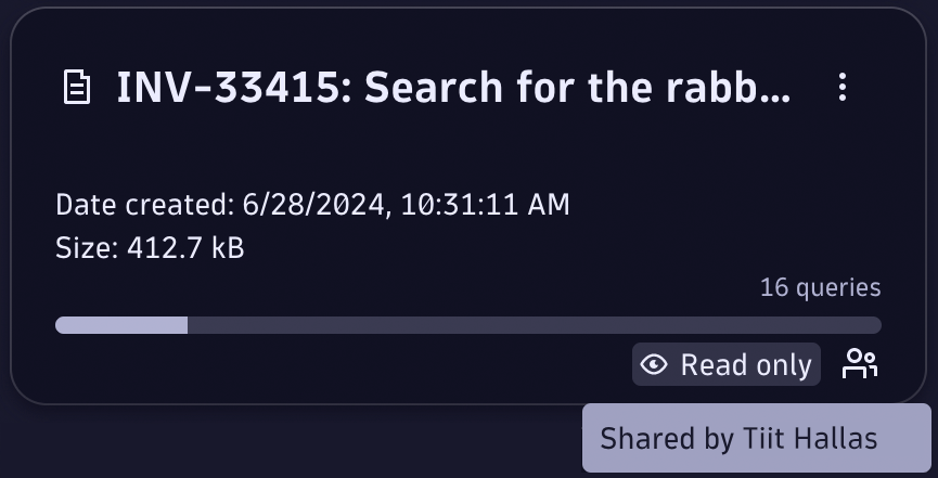 You can identify shared cases by a small Shared icon on the main page of Security Investigator. Cases you have shared are marked with a blue icon; cases shared with you include a white icon. Hover over the Shared icon for more details about who shared the case with you. If the case is shared with you in read-only mode, you’ll see the respective label next to the icon.