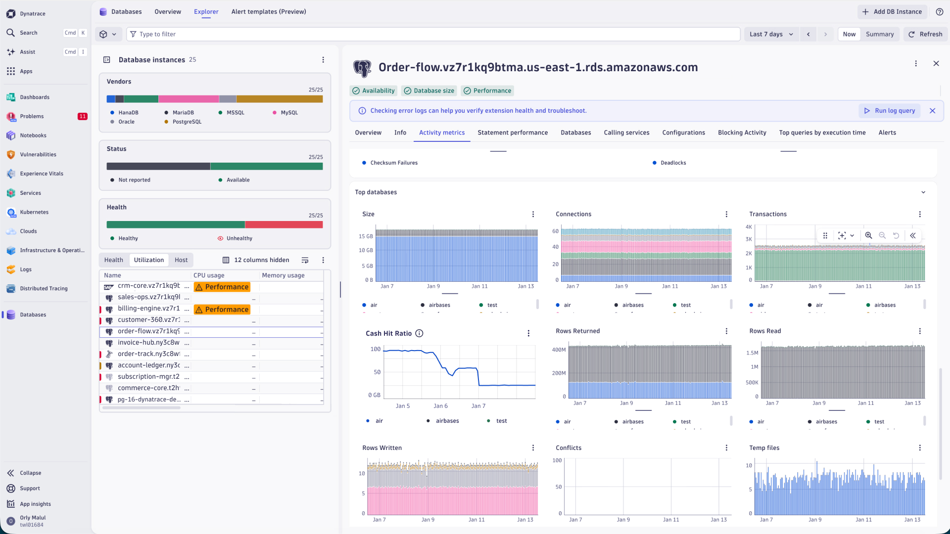 With real-time intelligence, Databases eliminates silos to help you optimize performance, reduce time to resolution, and deliver a seamless user experience. Combined with APM integration, Dynatrace delivers end-to-end visibility from services down to individual database queries, so you can understand how the layers interact.