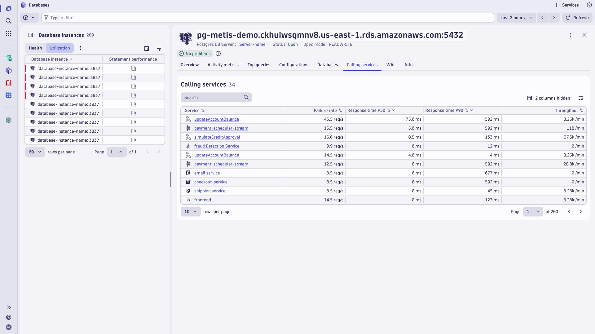 From the database host overview page, go to the Calling Services tab. Here, you can pinpoint which service is causing, or is impacted by, the issue based on certain metrics:
