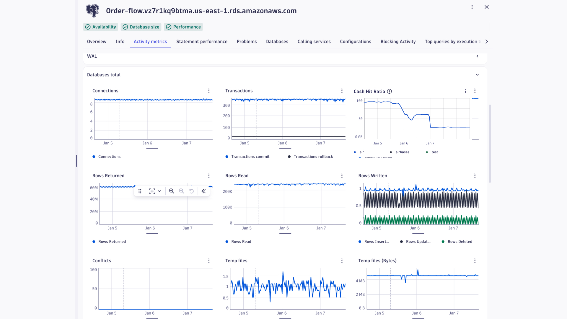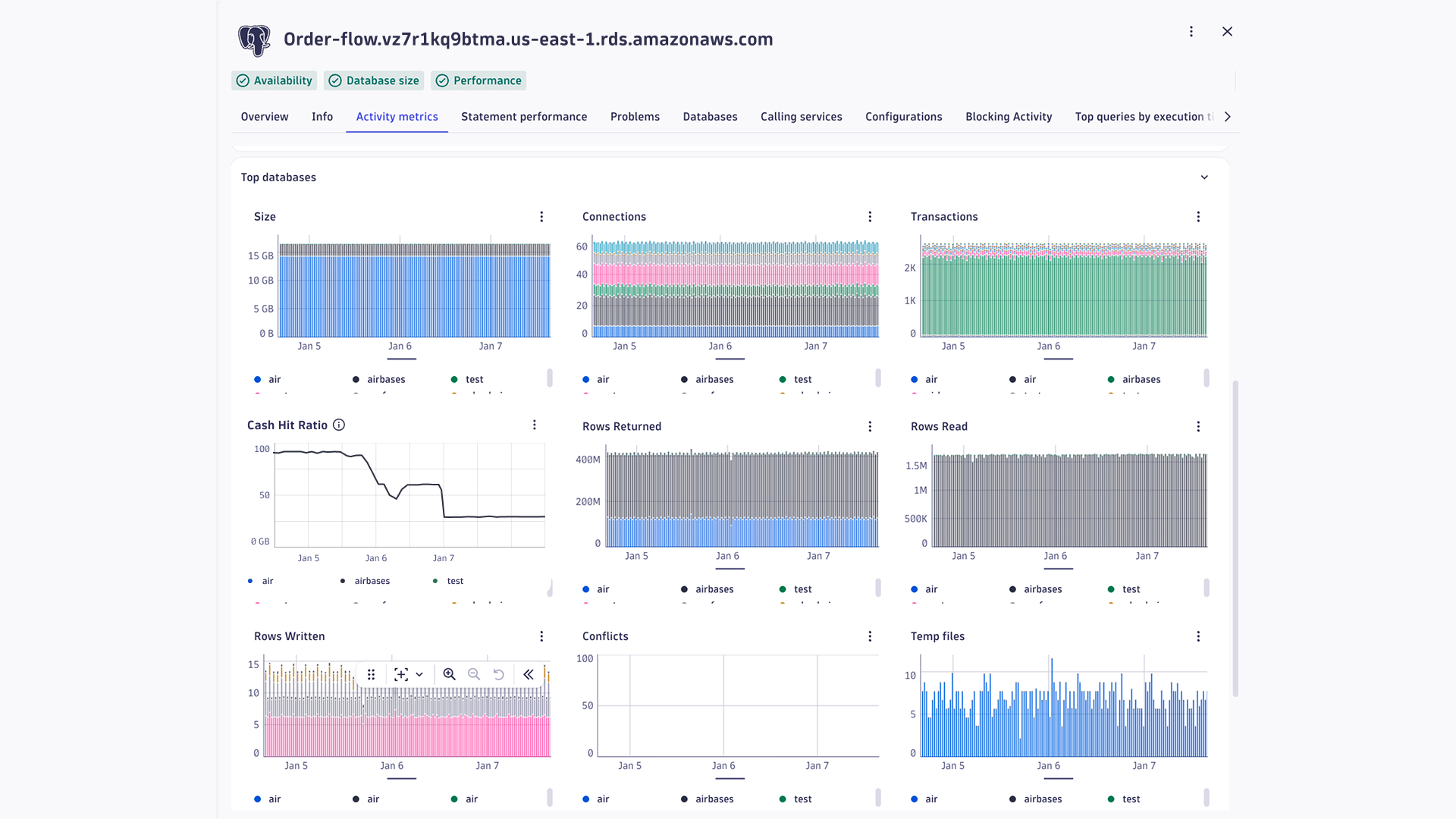 In the above graph, we can see that the problem is within the airbases. Now that we know which database is causing the problem, we can access it and debug the queries that are contributing to the low database Cache Hit Ratio.