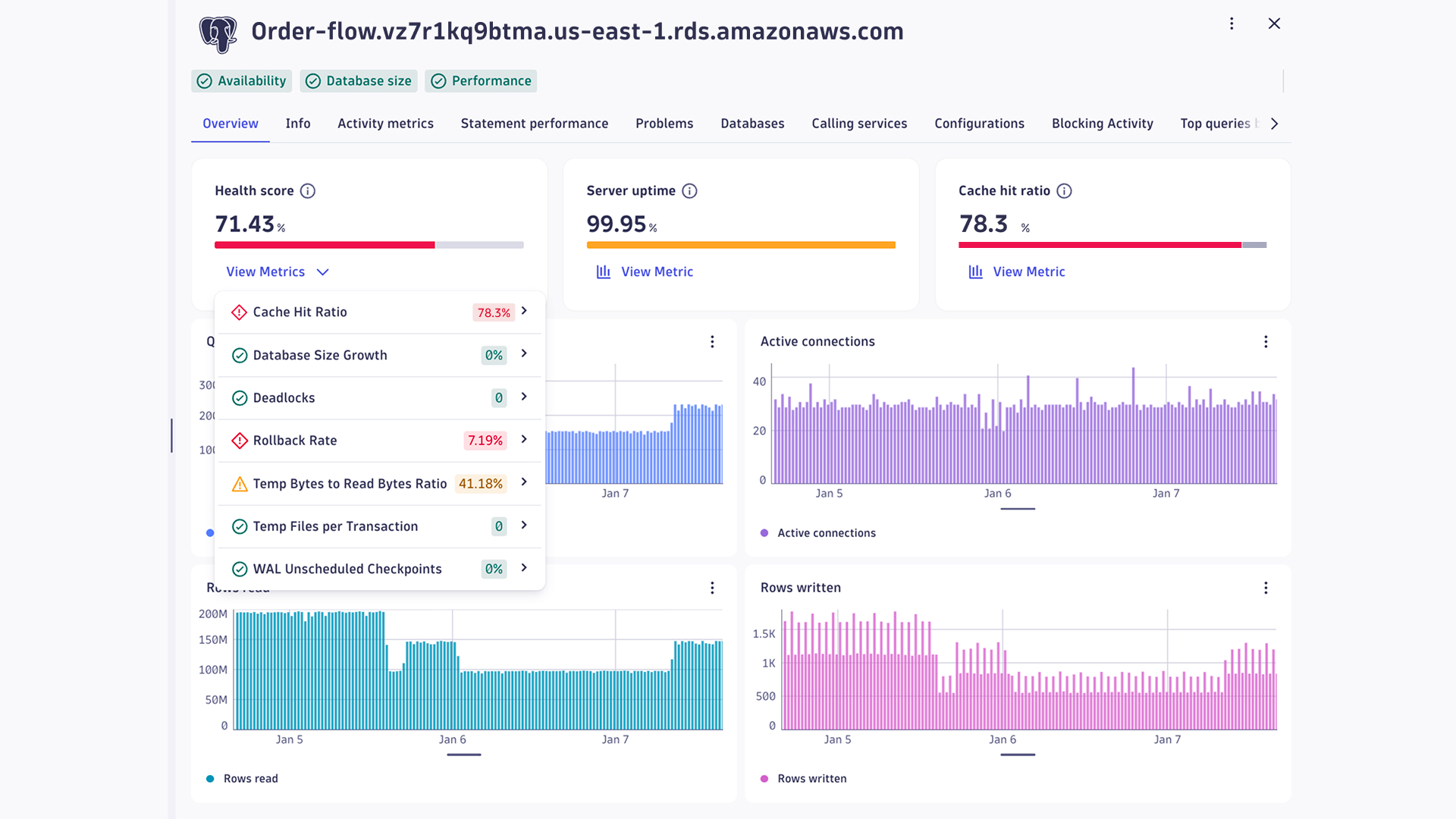 Once you have a clear indication of what’s preventing a database from maximizing its potential, you can dive deeper into that specific database and the database calls reported as the root cause of the problem, all from the health score.
