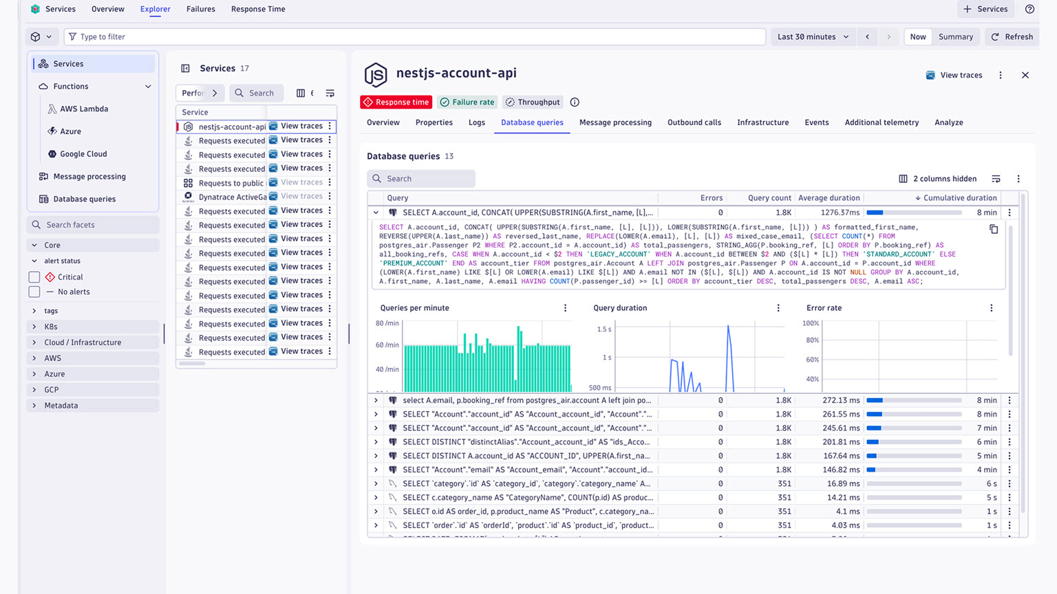 - Query-level analytics and transaction tracing across services to pinpoint performance bottlenecks.