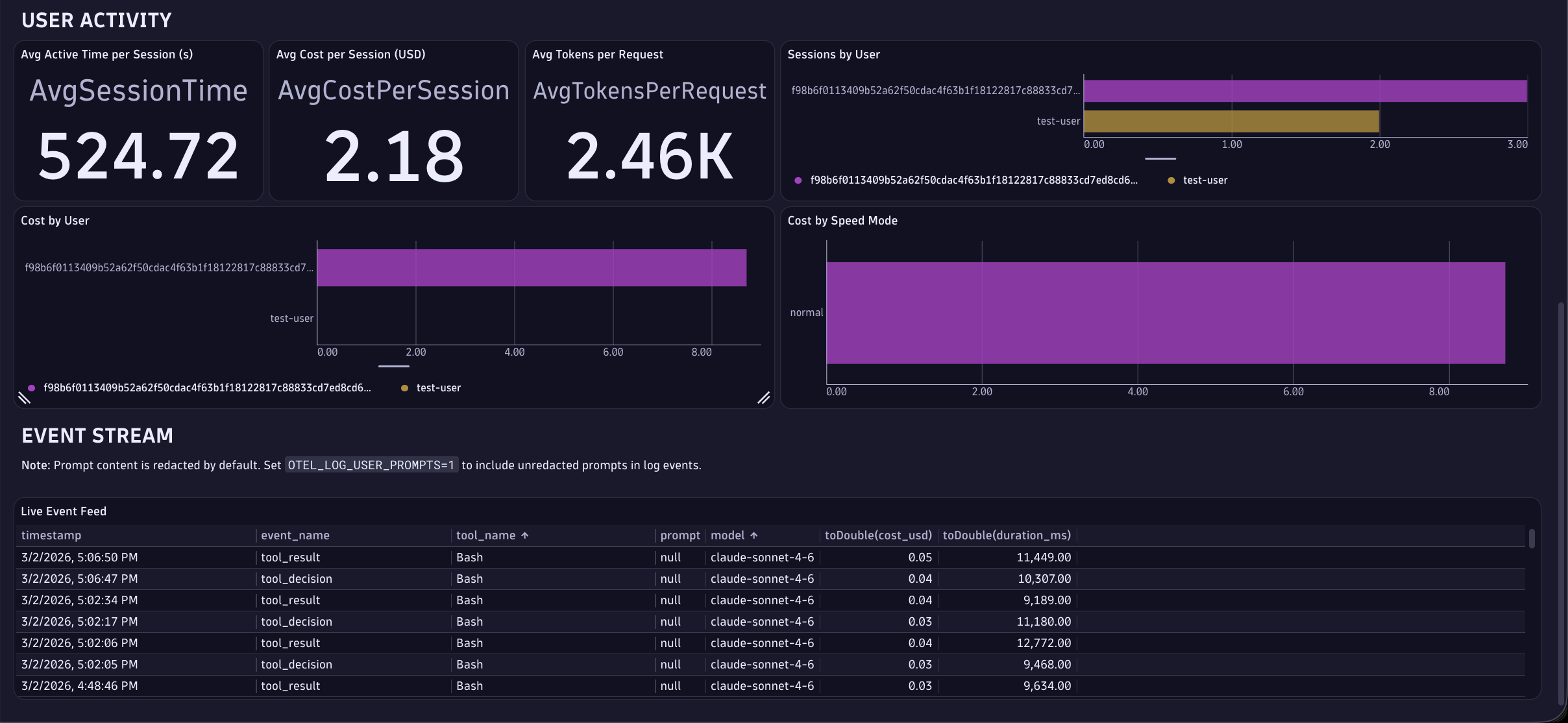 Claude Code already supports built-in OpenTelemetry, making it easy to send metrics and logs to Dynatrace with no code changes. Teams can track sessions, tokens, costs, tool activity, API health, and engineering output such as commits and pull requests. Logs, dashboards, and alerts help teams investigate failures, spot latency spikes, and catch unusual spend or error patterns early.