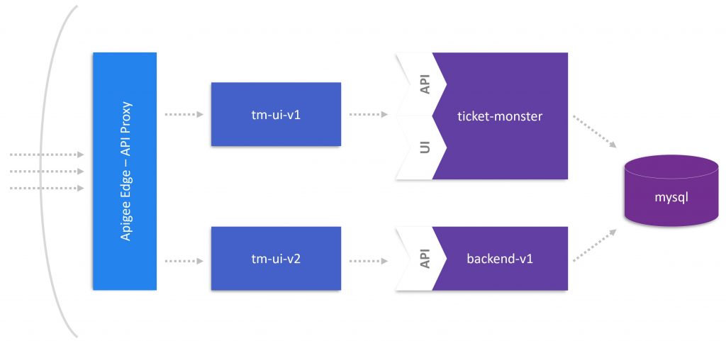 This blog post focuses on removing the legacy UI from TicketMonster in a fearless manner. Therefore, we first want to understand whether the introduced tm-ui-v1 somehow impacts the users in a negative way. If the new front-facing component of TicketMonster behaves as intended and causes no performance deficit, the next step disconnects the old UI and removes it from the code base. This step creates a thinner backend version of TicketMonster (backend-v1) that will be introduced using canary release mechanism.
