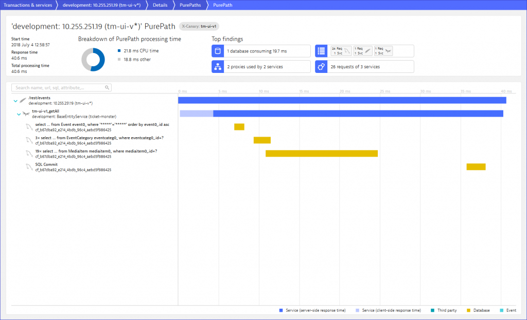 Before moving on, we want to quickly touch upon a concern that may arise regarding visibility. Is it still possible to trace a request even though we decoupled tm-ui-v1 from TicketMonster? Don’t worry, Dynatrace automatically captures all requests end-to-end and can still trace each step among services and on code level. Just check out the PurePath of a request from tm-ui-v1 and you will get a picture as shown below. This screenshot depicts tm-ui-v1 as request initiator that calls an endpoint of ticket-monster, which performs the method getAll. Moreover, we also see tables that get queried. All in all, the full end-to-end visibility of a service request is ensured.