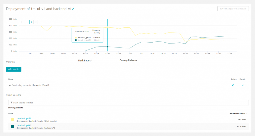 The result of turning on the rule is depicted by the Dynatrace custom chart below. According to this chart, tm-ui-v1 (yellow line) took the entire load of TicketMonster at the beginning of the timeframe. Around 1:12 pm the rule became activated. This brought the dark-launched tm-ui-v2 and backend-v1 (green line) into play and transferred load of a simulated user group from tm-ui-v1 over to the new components.
