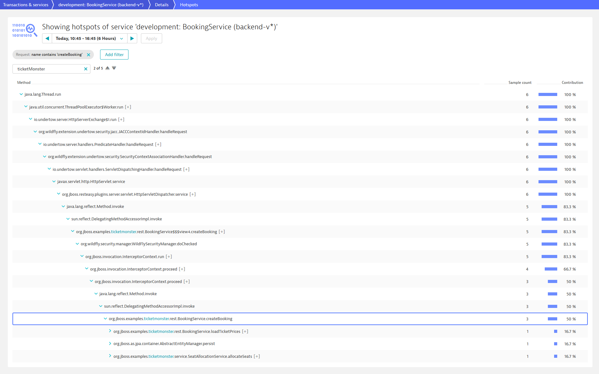 In the case of TicketMonster, we can select one of the four services mentioned above. Let’s investigate, for instance, BookingService that deals with booking tickets what is a business-critical domain of TicketMonster. After selecting this service by a click on the component in the ServiceFlow, the View method hotspots brings us to the PurePaths. There we can filter, for example, on the endpoint /createBooking and search for a method invocation of our source code. The screenshot below shows the result of this step.
