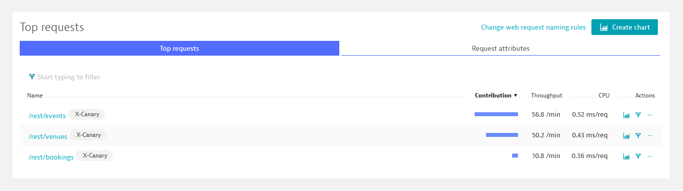 In addition to resolving dependency information, Dynatrace captures every single transaction end-to-end, identifies application endpoints (whether REST endpoints, web services, or queues), and shows throughput as well as resource consumption per request. This information is displayed in the screenshot above and allows us to make better decisions on which endpoints we first want to consider for a microservice candidate. If we want, for instance, to minimize risk, we might choose those entry points with the lowest throughput. On the other hand, we would focus on heavy CPU consumers if we want take load off the monolith.