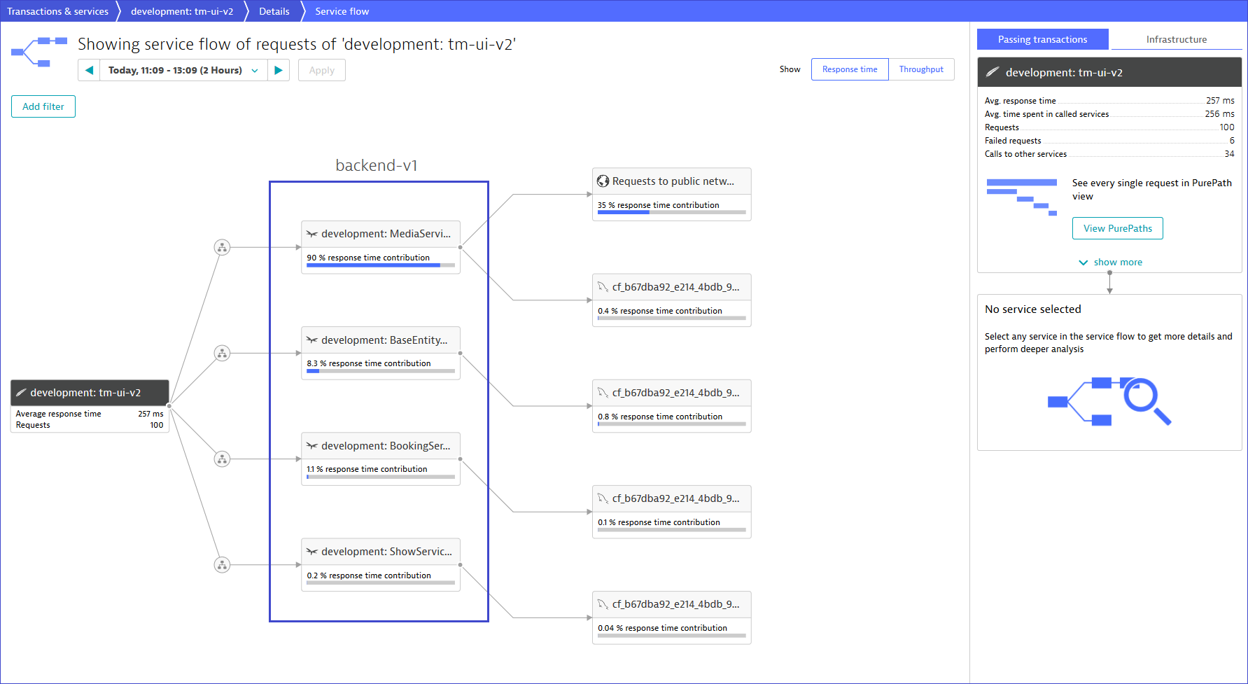 “I’m wondering, the user interface tm-ui-v2 of TicketMonster is calling four services? Are these already microservices?” A careful reader may raise these concerns since we have introduced the monolith as single service in Set up TicketMonster on Cloud Foundry/OpenShift. At the introduction, we tried to keep complexity low by letting TicketMonster appear as a single service. Nevertheless, the monolithic application (backend-v1) contains already four independent services, as shown by the ServiceFlow provided by Dynatrace.