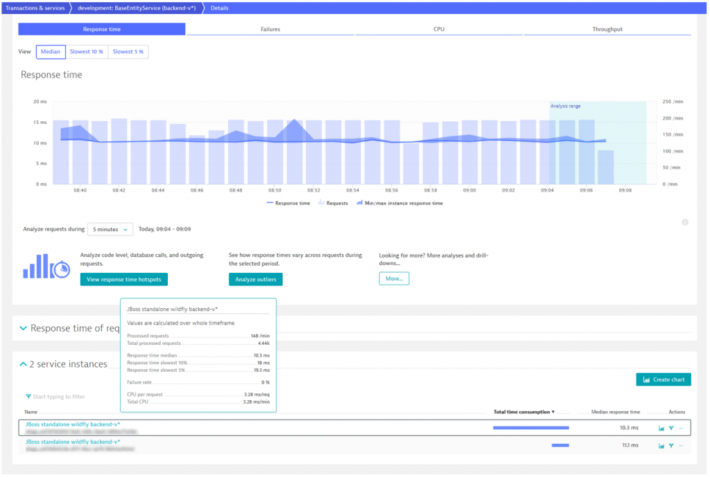 We can also verify that two different instances of the same service are up and running when looking into the Dynatrace transaction & services section. Dynatrace automatically detects all instances of a service and let us compare for example the number of processed requests and the response time of each instance as seen in the figure below.