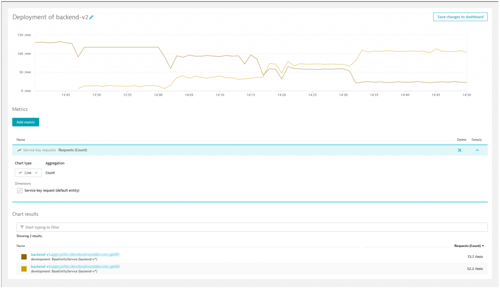 Since we are not noticing any issues, we can increase the traffic to 25 % percent starting around 14.00h. Again, we gain more confidence in the service and increase the load over time, as we can see by the “steps” in the chart in the figure below.