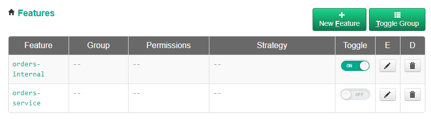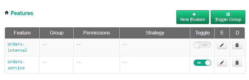 After deploying the backend-v2 service we will be able to access the ff4j web console with the ability to directly toggle the feature flags to enable either (i) the internal orders service from backend-v2 to be called (as shown in the screenshot below), (ii) sending synthetic traffic to the OrdersService by enabling both toggles, or (iii) calling of the new OrdersService by disabling the orders-internal and enabling the orders-service feature flag.