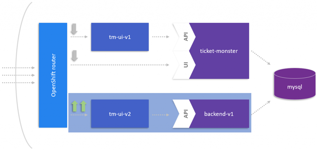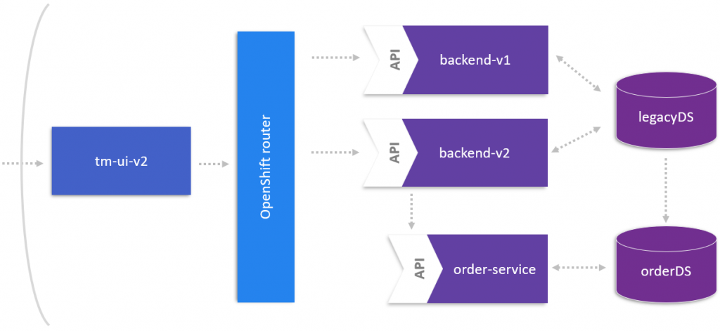 The initial situation for this current article is were we left off in Part III: we have deployed the backend-v1 for which we already got rid off the UI from the monolith and we have deployed it’s own tm-ui-v2 as the UI frontend in front of it (see blue box below):