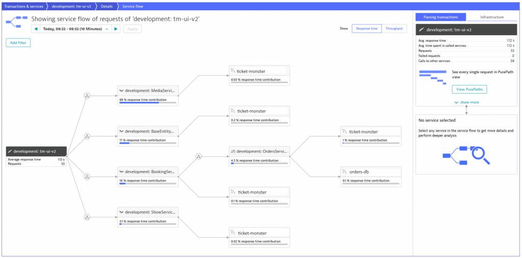 Let’s take a look closer look at the service flow above and verify which services are called in our application. Requests received by the frontend highly consume the MediaService, since a lot of media is provided by the TicketMonster and this component is responsible for delivering it. We can also verify how often the BookingService is called. Furthermore, we see that the BookingService has both calls to the OrdersService as well as the ticket-monster database. The reason is that before switching the feature toggle to the microservice, the BookingService was directly communicating with the ticket-monster database. When looking at the OrdersService, we see a data flow to both the ticket-monster and the orders databases. Again, the answer is quite easy: with the database virtualization we introduced in Part V, we defined that the OrdersService gets a union of all bookings from both databases. All in all, we see a clear and complete picture of the service flow in our application including the newly introduced microservice. Great, everything looks like expected and with Dynatrace we have a live validation on our actual environment!