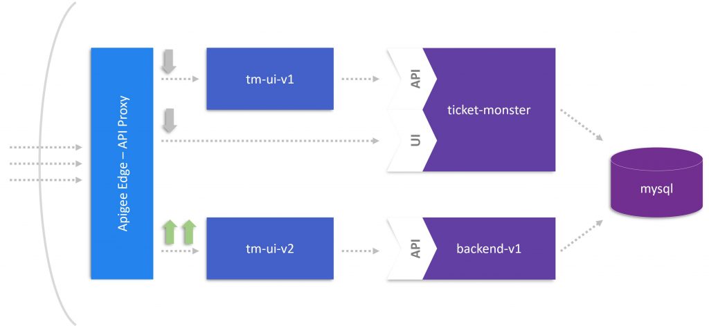 If you followed the storyline of our monolith to microservices journey, you will remember that we extracted the UI from TicketMonster in part 3. The below figure shows the final stage of part 3 illustrating the traffic redirected from tm-ui-v1 and ticket-monster to tm-ui-v2. This state concludes that the original monolithic application (ticket-monster) including the UI became obsolete because tm-ui-v2 with backend-v1 took over the entire load. In addition, we didn’t need the Apigee Edge API Proxy anymore because there was no need for rerouting UI calls.