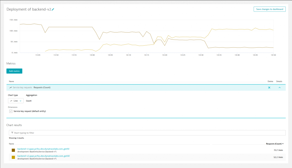 You want to see the deployment strategy in action? Perfect, let’s use Dynatrace that provides the insights therefore. To illustrate the scenario, we use a load generation script provided on GitHub in load-generation. Just follow the instructions and you can create real-user traffic on tm-ui-v2 that will be forwarded to the API Proxy. The next screenshot depicts a user traffic of approximately 130 requests per minute.