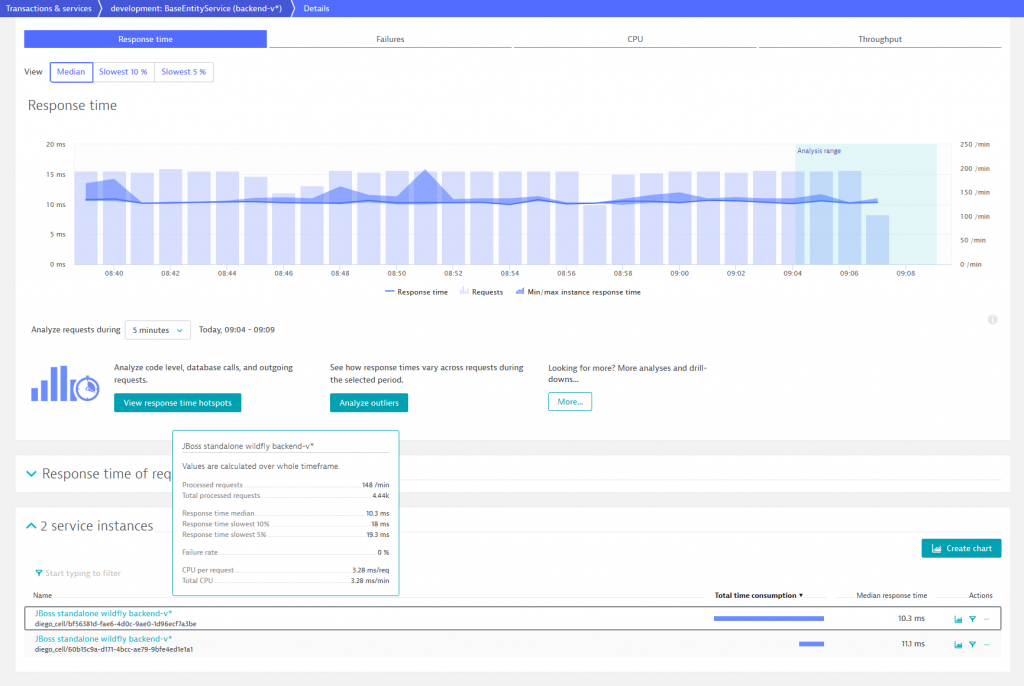 While we deploy the second version of the backend service, Dynatrace automatically recognizes backend-v2 as new service instance and adds it to the corresponding process group that already contains backend-v1. Consequently, two service instances are now displayed when opening the BaseEntityService details page and we can compare the number of processed requests and the response time of each instance.