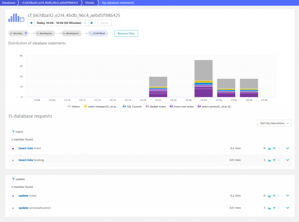 To explore the data model of OrdersService, we can reconsider TicketMonster’s ServiceFlow in Dynatrace. The ServiceFlow depicts a database entity at the end of each flow indicated by the MySQL icon. By following the path through OrdersService, we see a MySQL entity that collects all statements OrdersServices fires to a database. To list them all, just click on the database and then on View database statements. There we can see that OrdersService interacts with multiple tables but performs insert and update queries just in the tables Booking, Ticket, and SectionAllocation. Given this information, we know that new data must be stored in one of these three tables defining the data model of OrdersService.
