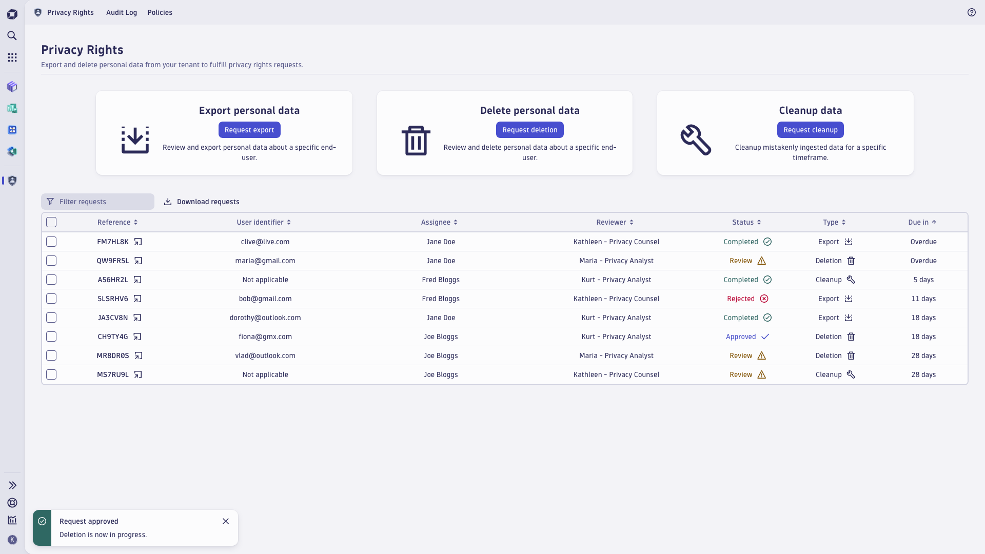 Across the globe, privacy laws grant individuals data subject rights, such as the right to access and delete personal data processed about them. Rising consumer expectations for transparency and control over their data, combined with increasing data volumes, contribute to the importance of swift and efficient management of privacy rights requests.
