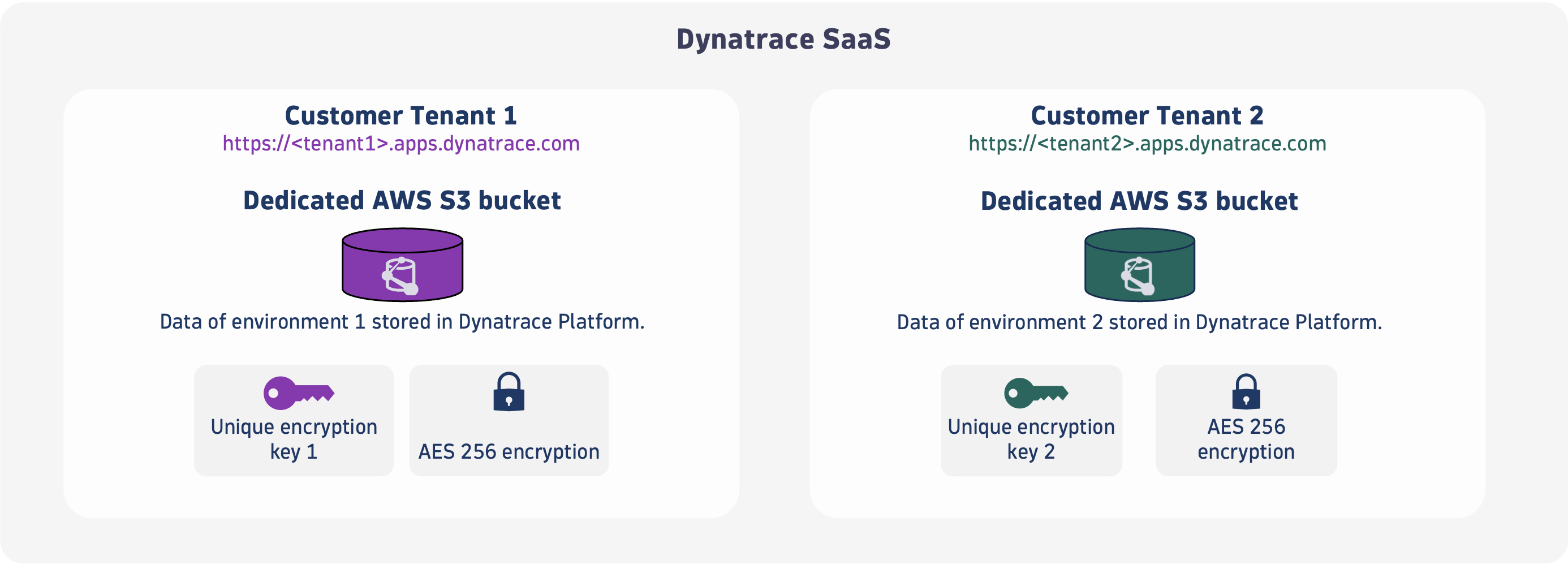 On AWS, each Dynatrace tenant now has a dedicated S3 bucket assigned to it. All new Dynatrace platform data at rest is stored in such a dedicated S3 bucket. S3 buckets are configured to be encrypted with a bucket key stored in the AWS key management system (KMS). Each S3 bucket is assigned its own unique bucket key. All bucket keys are managed by Dynatrace and are configured to rotate automatically after 365 days.