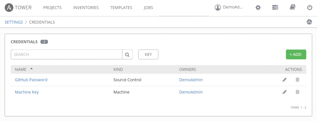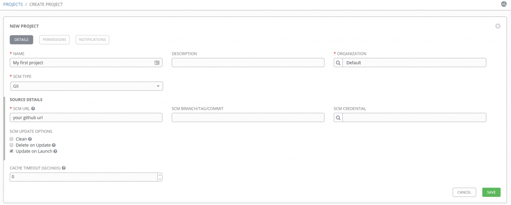 site.yaml), which is stored in the GitHub repository. The playbook defines the actions that are to be taken when executing this job template. - Define an inventory (Demo Inventory) where the required credentials and the project can be found.
