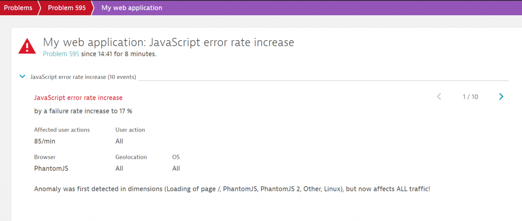 Suppose you deploy a new version of your web application and no errors are detected during deployment. Let’s say that you then discover a performance decrease in production that indicates there are undetected problems in the new version. Thanks to Dynatrace, such problems will be detected and reported with the help of our smart baselining as soon as several users are affected by the problem. With your Ansible Tower integration in place, Dynatrace will alert your Ansible Tower, and send you a problem notification in order to start your auto-remediation.