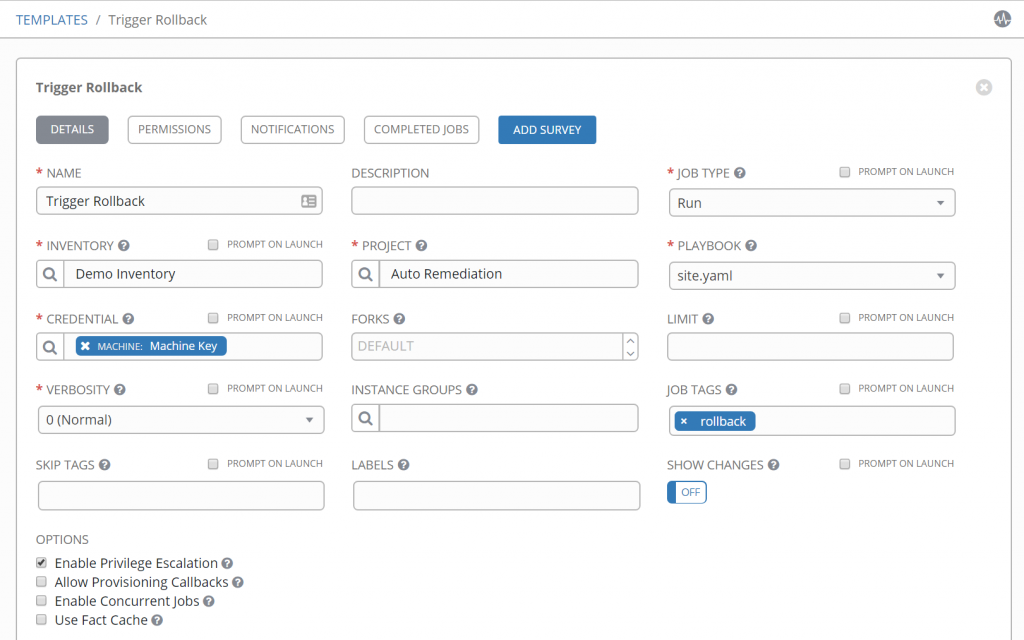 In this example, we’ll:- Run the template (Trigger Rollback) and execute the playbook (