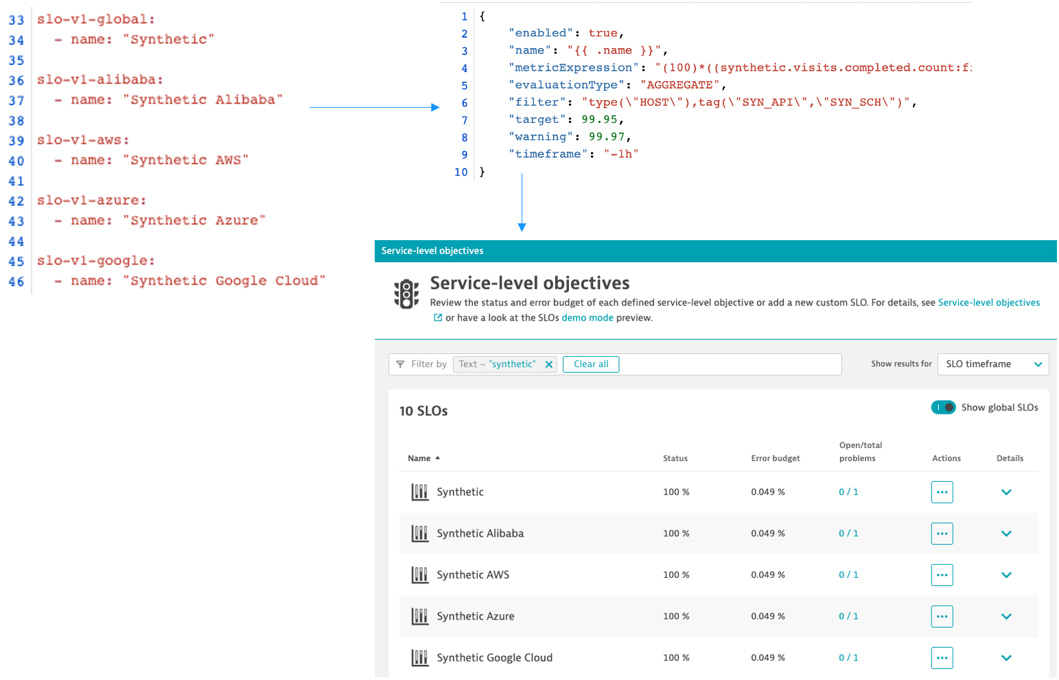 Many observability solutions don’t support an “as code” approach. They require manual effort or might even render automated approaches impossible due to: