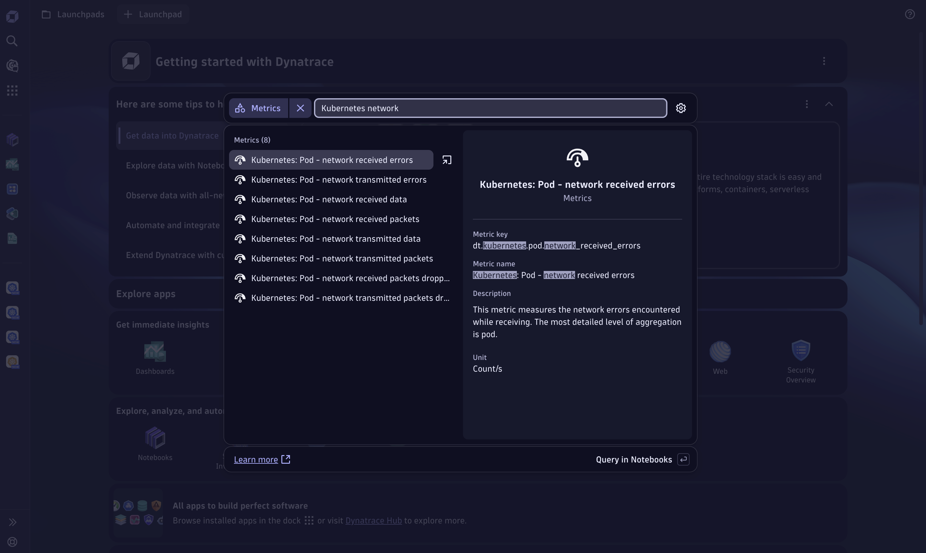 Imagine a colleague mentioning a newly released metric for Kubernetes during a coffee break. Rather than manually exploring the Kubernetes app you can simply open the Dynatrace global search and enter “Kubernetes network.” The relevant metrics are then immediately displayed alongside further details.