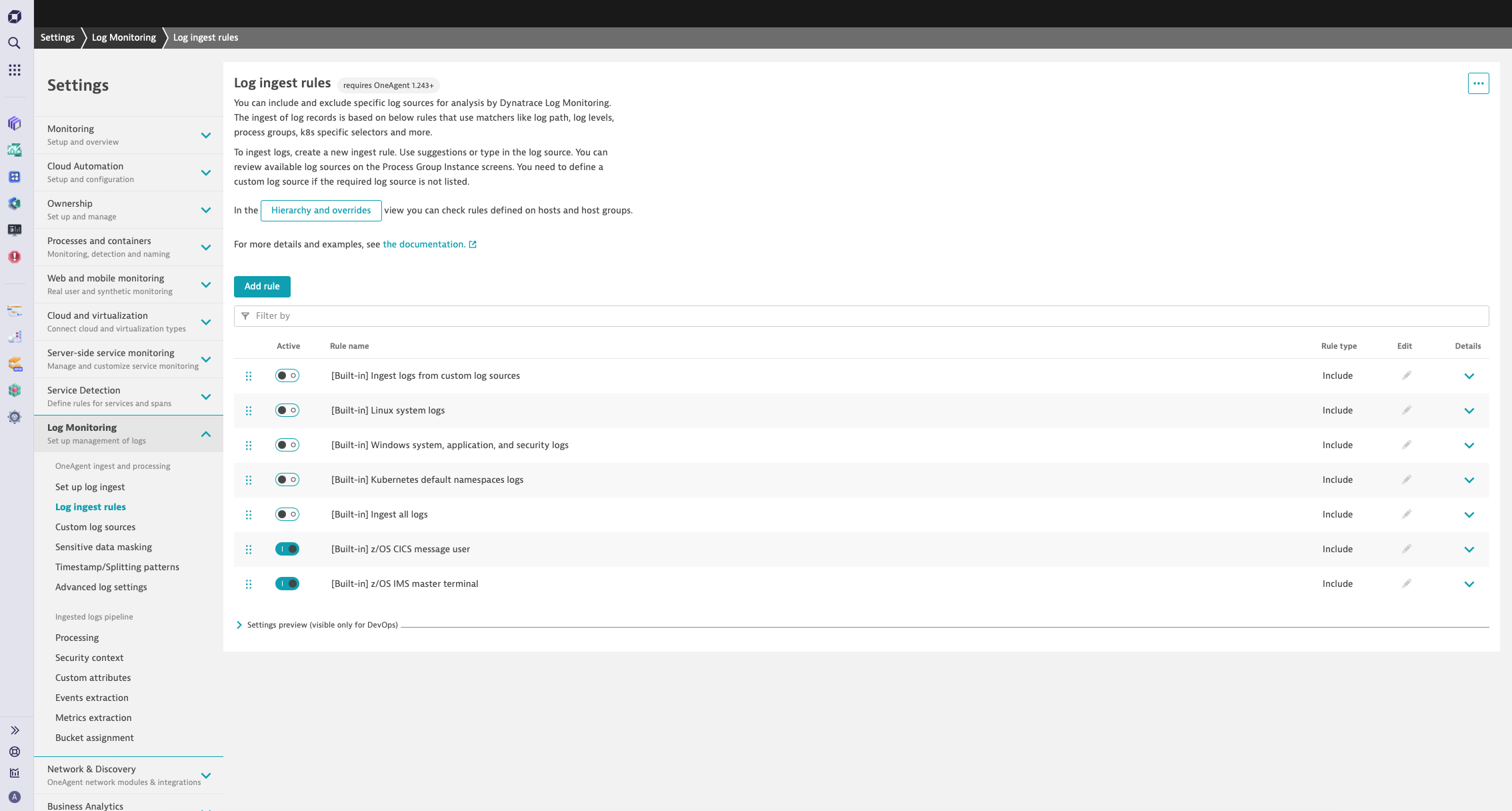 Get started with Log Management and Analytics powered by Dynatrace Grail™ or Log Monitoring Classic (for Dynatrace Managed deployments). To start, deploy Dynatrace on your IBM z/OS operating system and set up log collection. You can easily set up log collection by turning on the provided z/OS log ingest rules globally or for a specific host.