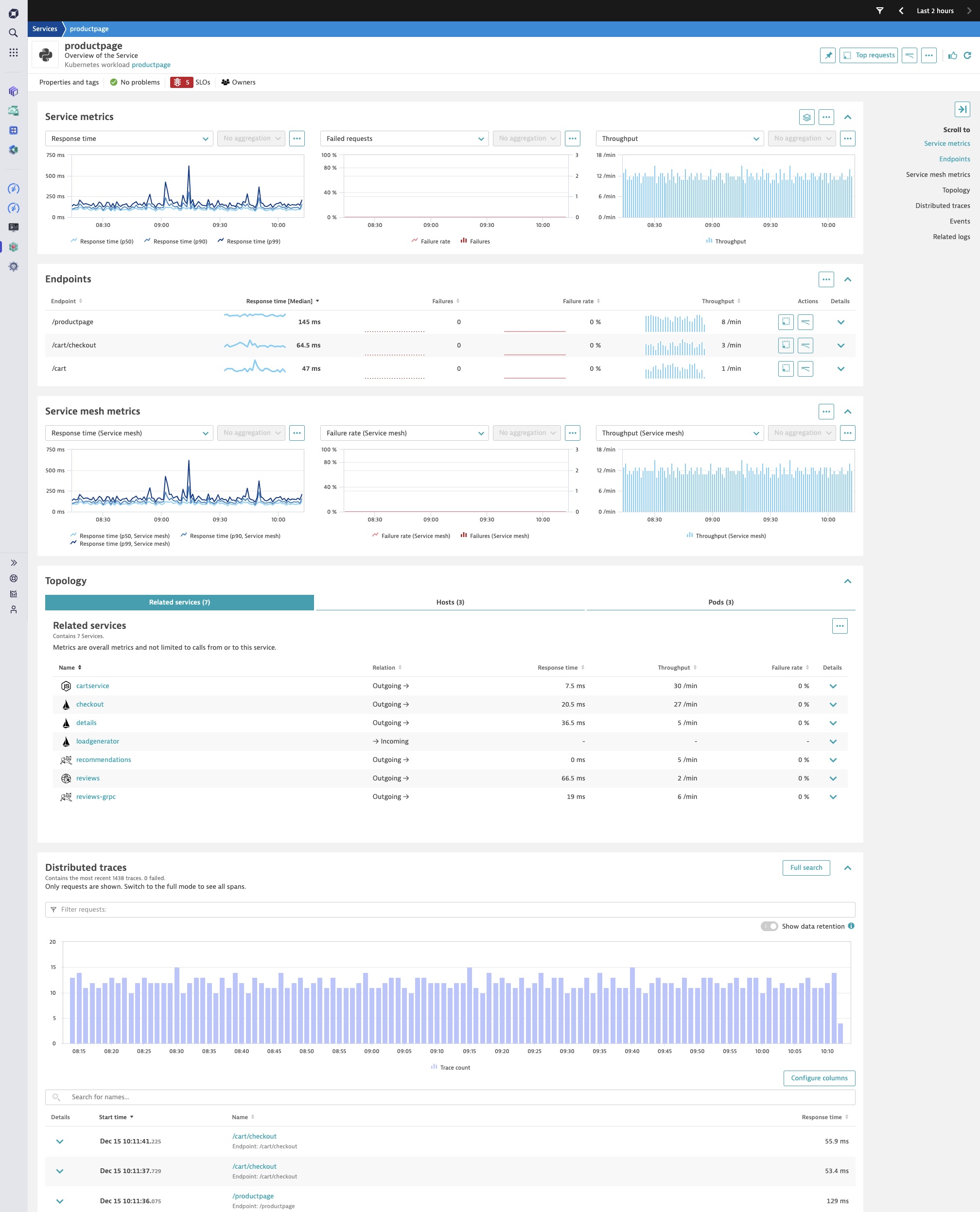 “When Dynatrace receives OpenTelemetry line protocol spans from Istio’s Envoy proxies, Dynatrace now automatically shows the performance of the proxy directly on the service screen,” Lima says. This detail from Istio service mesh is available using APIs now and will soon be available directly from OneAgent.