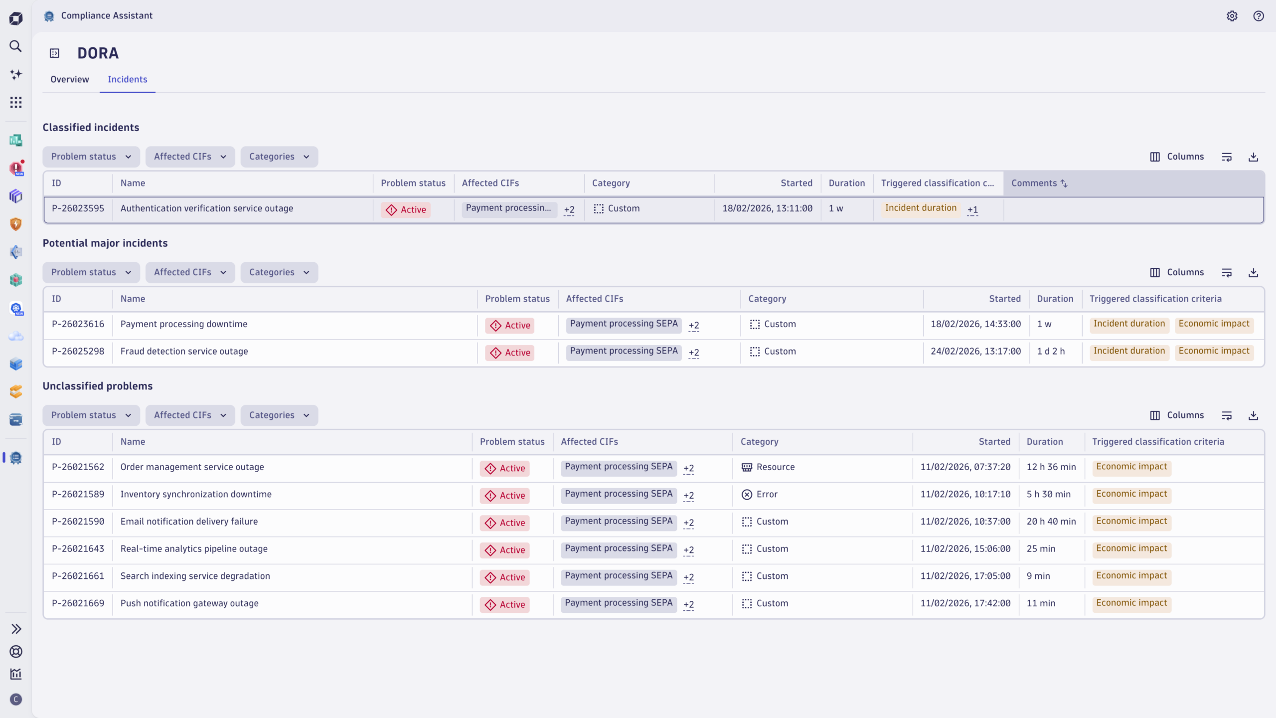 For example, if payment processing is down for 30 minutes and the estimated economic impact exceeds €100k, the incident meets one of EU DORA’s materiality thresholds and Compliance Assistant flags it accordingly.