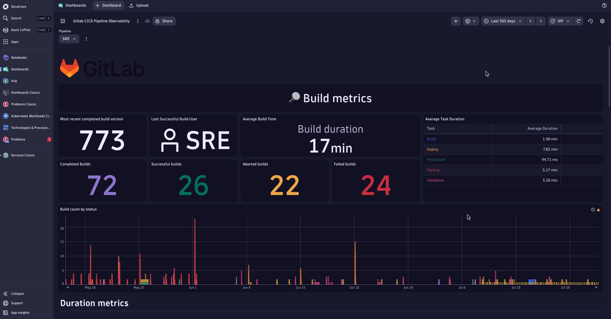 As seen below, leveraging the GitLab API in combination with Dynatrace Workflows, teams gain real-time visibility into pipeline behavior over time, eliminating uncertainty and improving confidence in delivery processes.