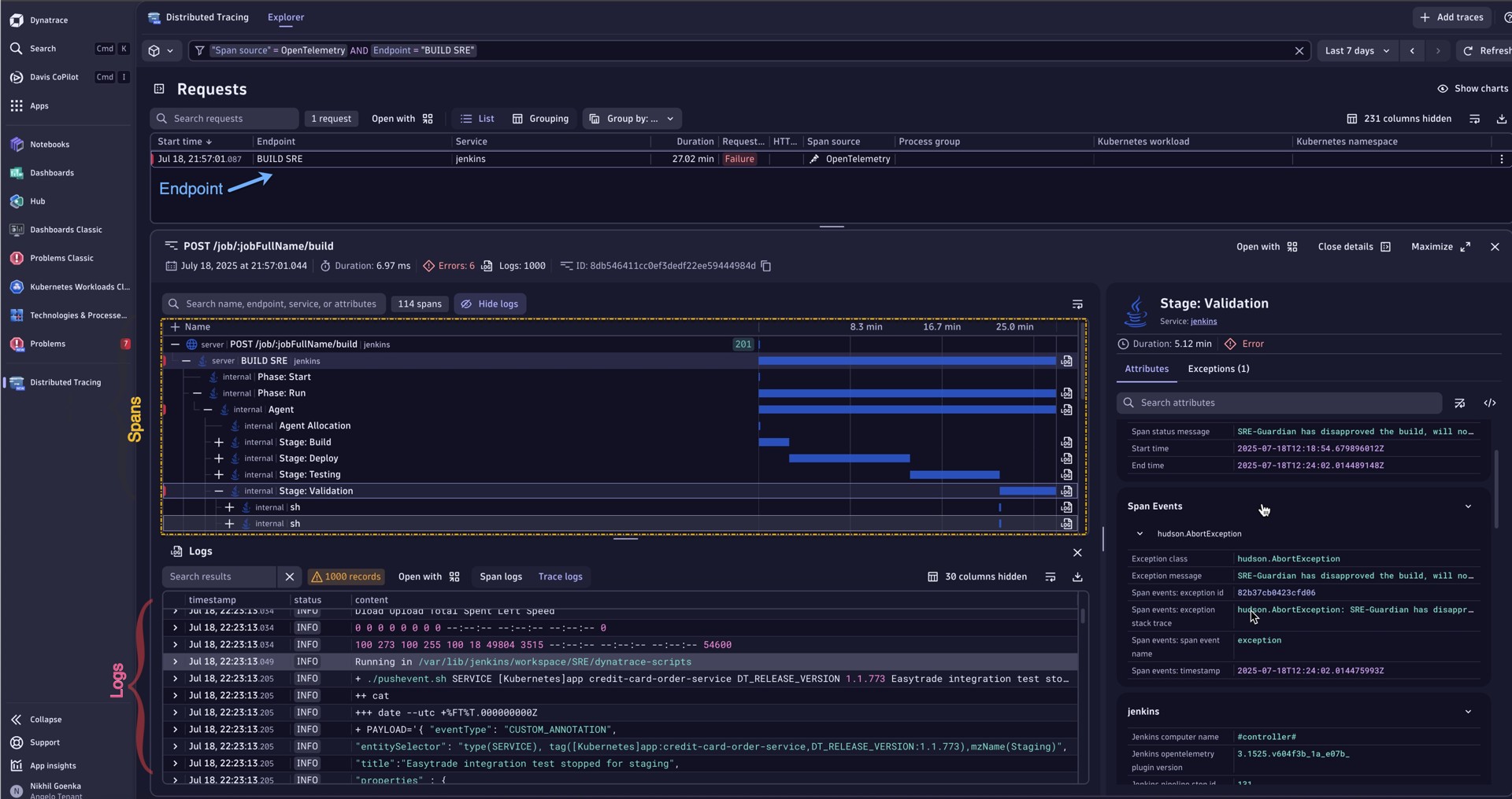 Furthermore, Dynatrace allows teams to drill into spans, logs, and exceptions using context-aware data, offering end-to-end visibility from the originating endpoint all the way to the underlying logs and exception traces, as seen in the example below.