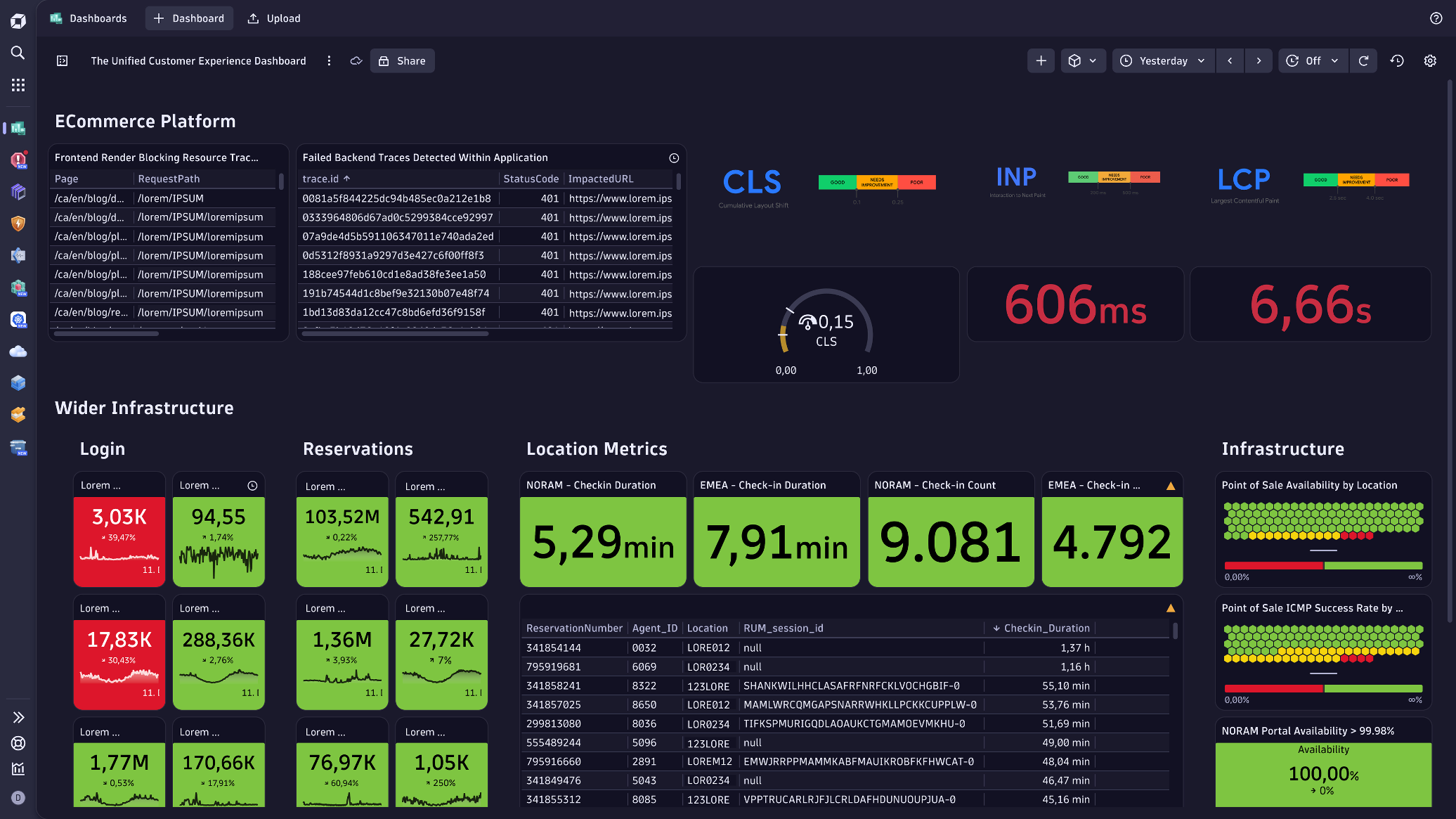Pre-built dashboards surface industry-standard performance metrics such as Core Web Vitals and key mobile signals, giving teams a clear and consistent view of frontend health. Unified dashboards bring frontend and backend data into a single view, making it easier to trace request errors to their underlying exceptions, monitor customer experience over time, and understand how performance issues impact business outcomes.