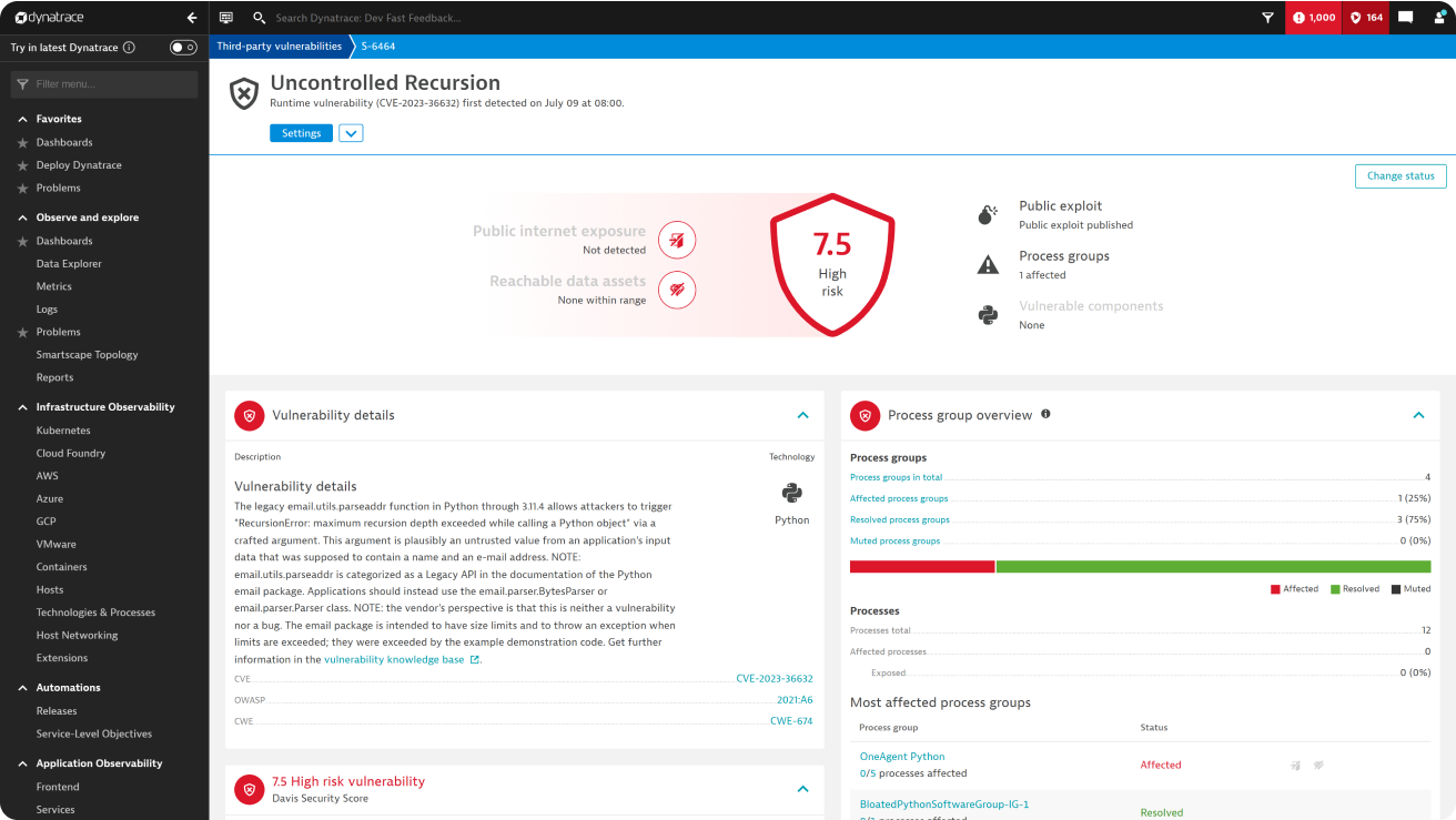 - Detect all running processes automatically, find vulnerable code, and prioritize vulnerabilities through our Davis® AI Security Score—particularly beneficial for AI/ML applications