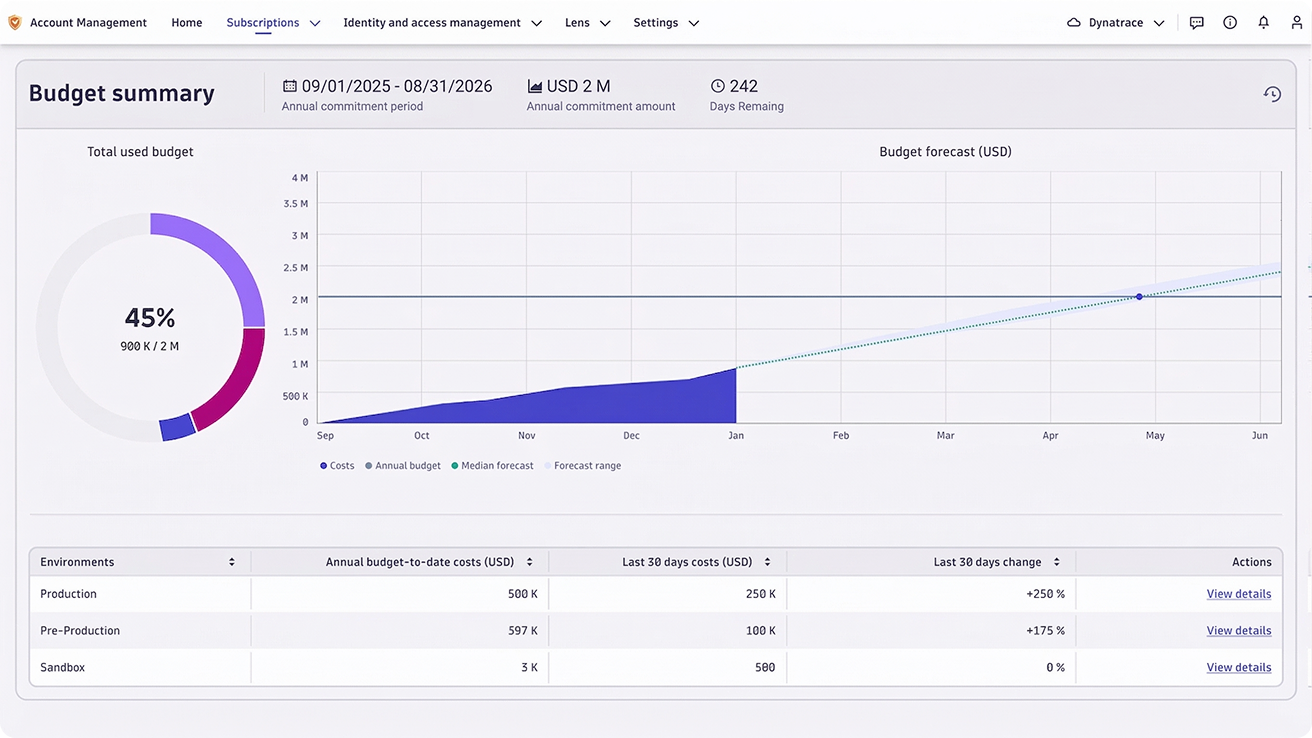 Built-in Account Management tools give you visibility and automatically forecast your consumption, with cost monitors that detect sudden usage changes and alert you before costs spike—no setup required.