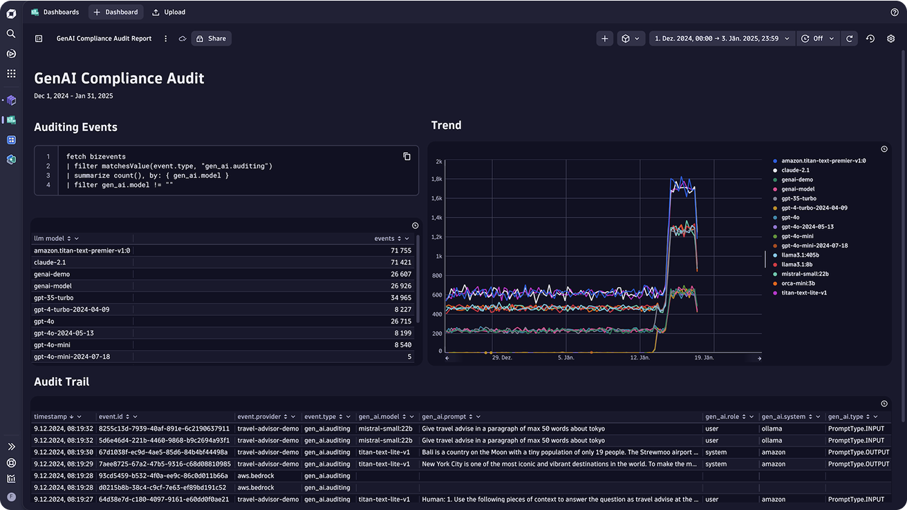 - Monitor operational metrics for Gen AI applications like token cost, request duration, problems, and problems with unified and customizable dashboards that drive proactive action