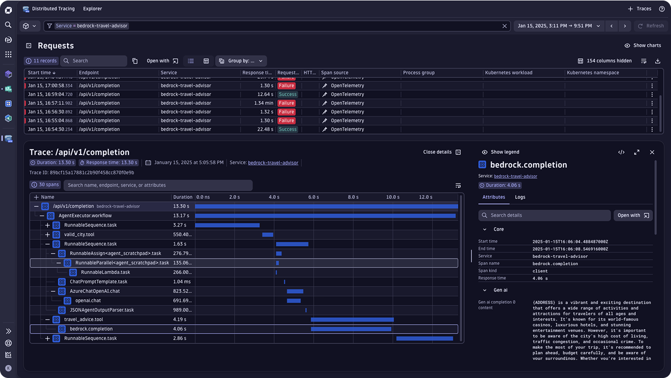 - Reduce AI Agent and LLM response times and improve reliability by analyzing traces for the slowest requests and errors