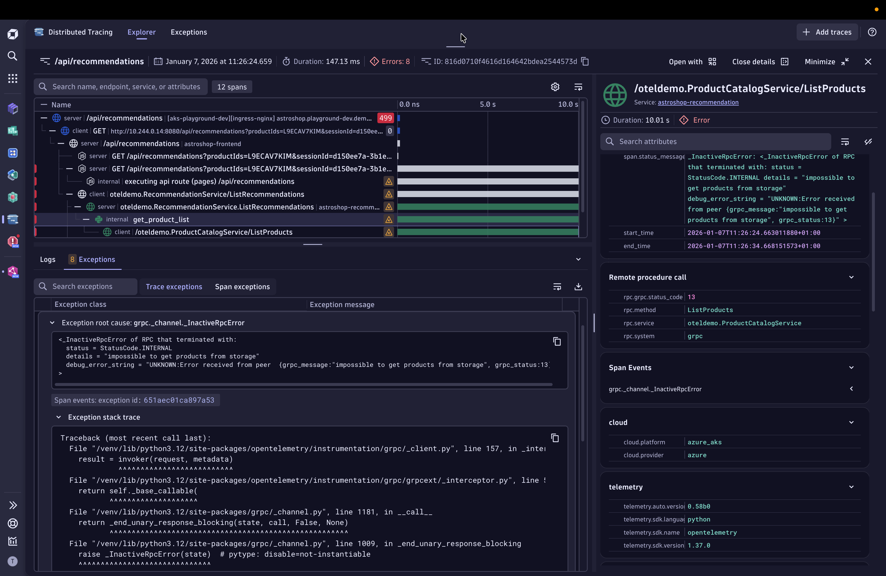 - Surface and analyze exceptions across entire traces with full trace context to find your needle in the haystack